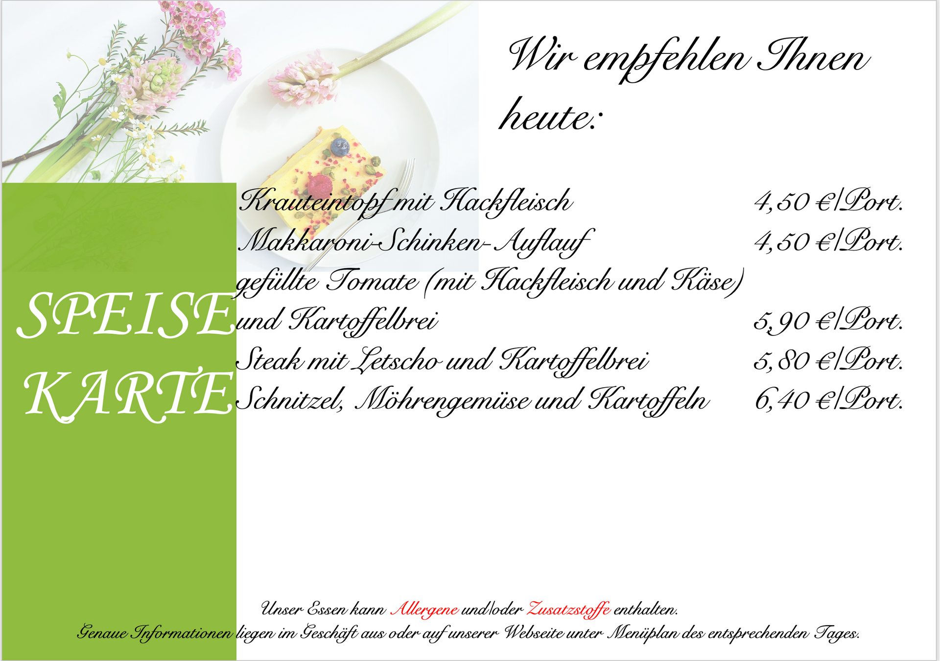 Hier stehen nur unsere jeweiligen Tagesgerichte. Unter dem Reiter "Mittagessen/Menüplan" und dem entsprechenden Tag, sehen Sie unser Dauersortiment, welches wir von Montag bis Freitag für Sie bereithalten.