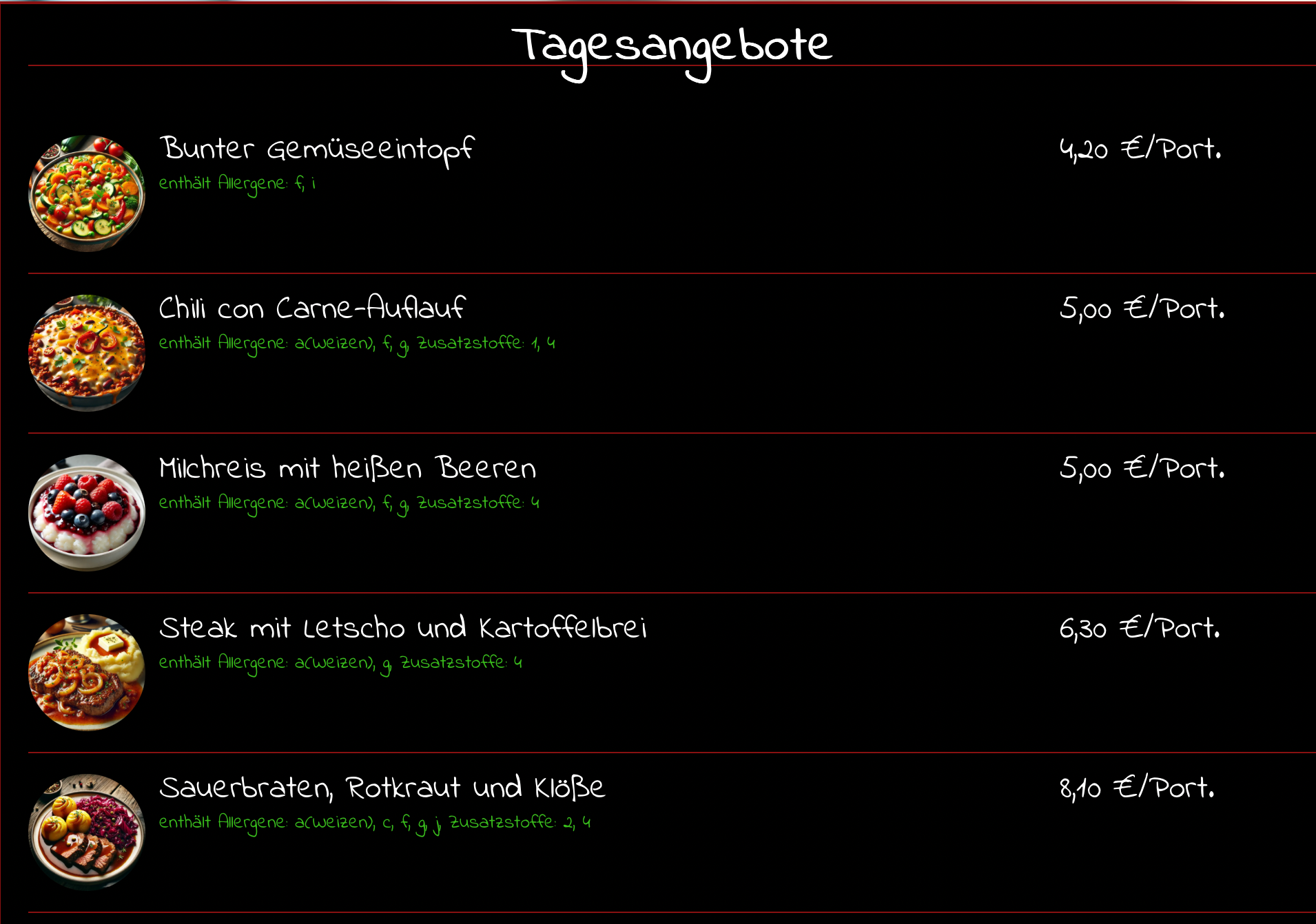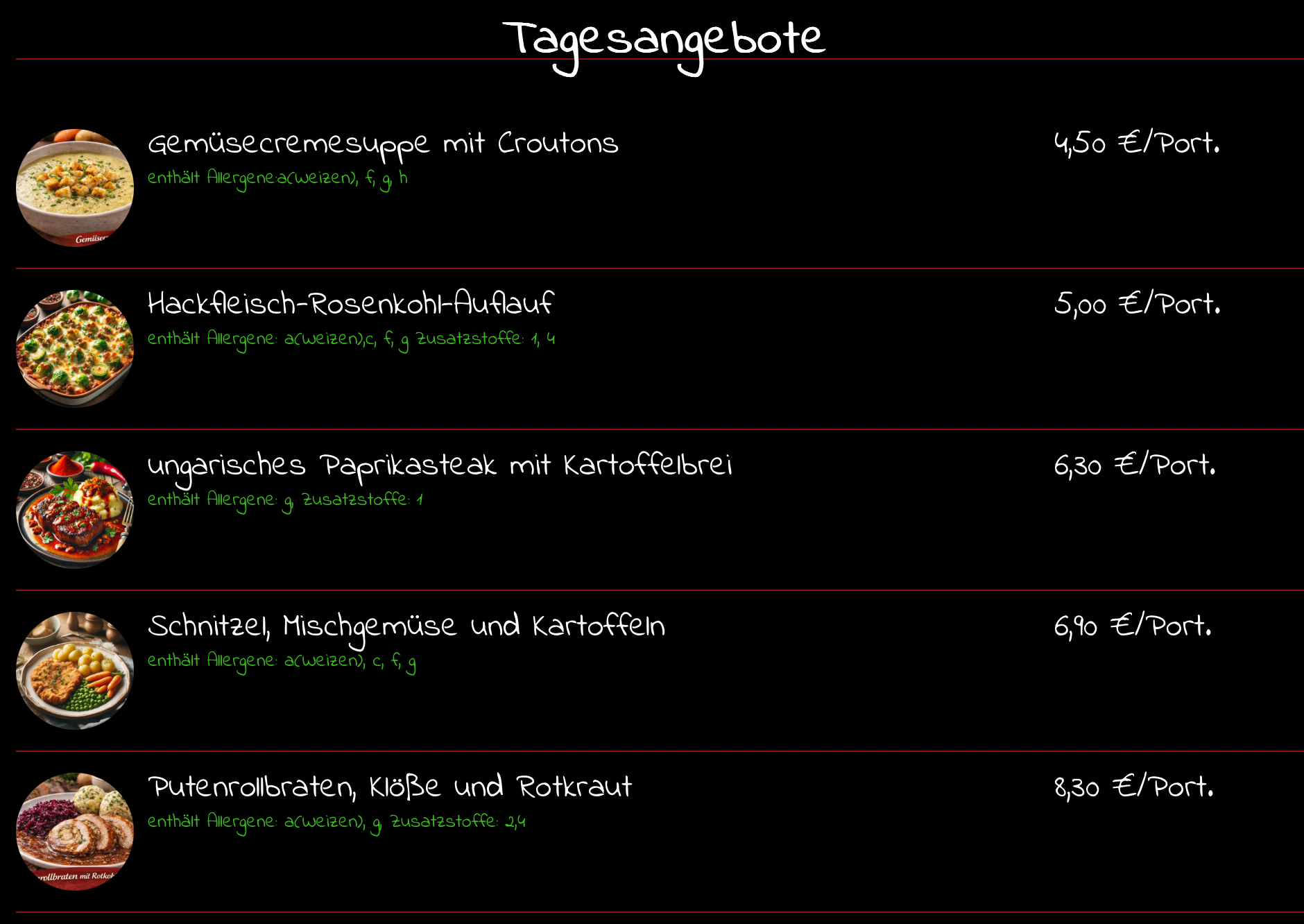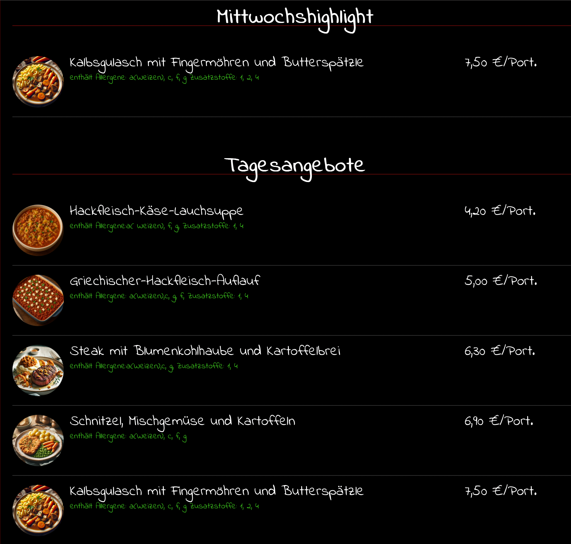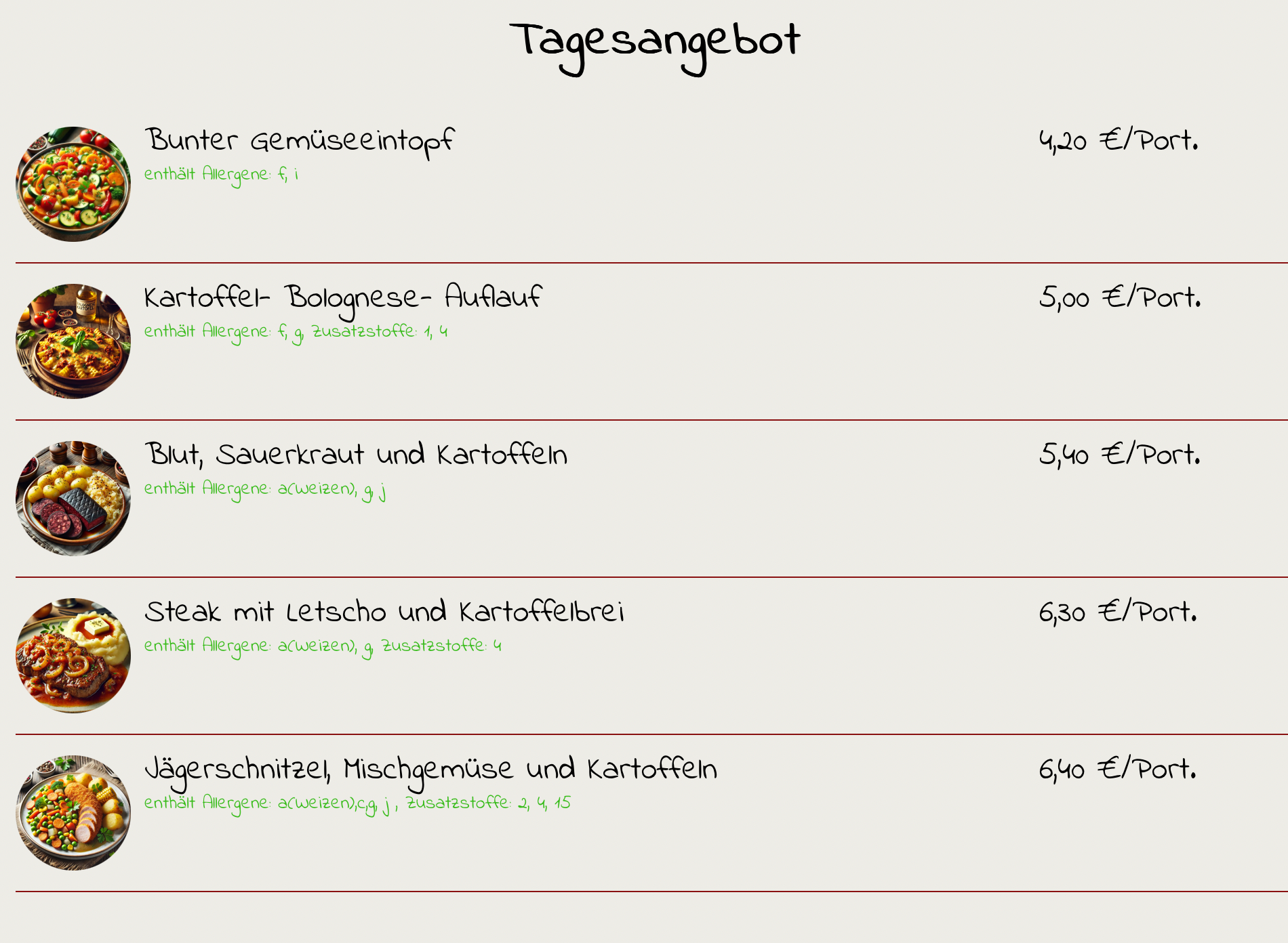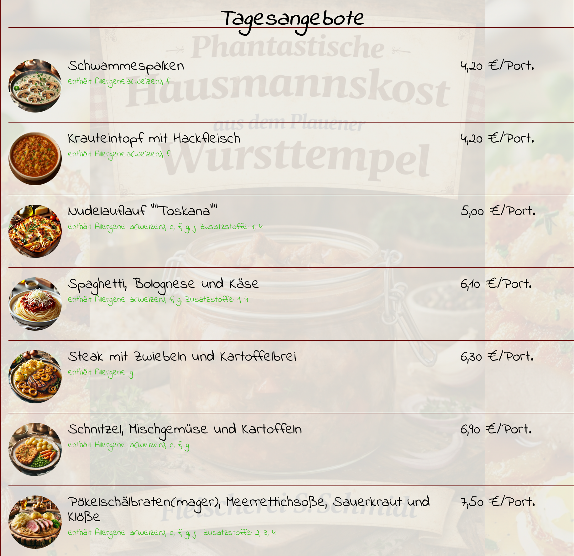Hier stehen nur unsere jeweiligen Tagesgerichte. Unter dem Reiter "Mittagessen/Menüplan" und dem entsprechenden Tag, sehen Sie unser Dauersortiment, welches wir von Montag bis Freitag für Sie bereithalten.